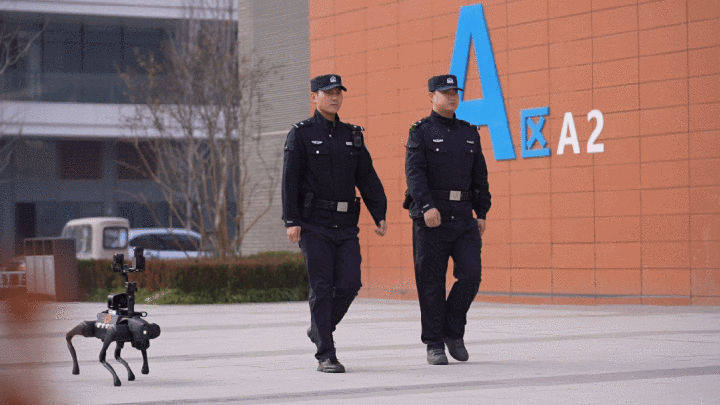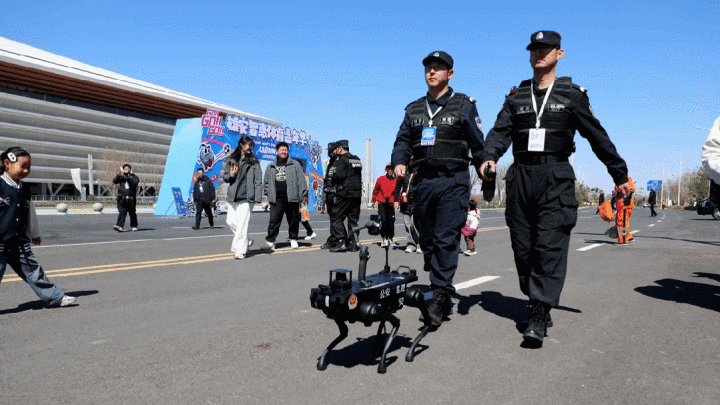 在新区首届国际女篮邀请赛、雄安马拉松、乒超联赛等大型赛事活动现场,警用无人机在空中盘旋巡查,实时传输现场画面,同时通过语音播报疏导人群。场馆内外,警用无人巡逻车与机器狗协同巡逻,巡逻车凭借智能化分析实时排查风险隐患,机器狗则循着预设路线自主穿梭,自动伴随巡逻,成为安保现场的“硬核力量”。