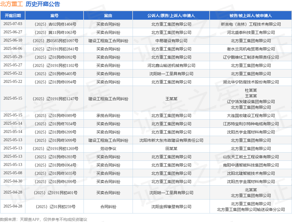 案号:(2025)冀11民终1063号审理法院:河北省衡水市中级人民法院案由:买卖合同纠纷当事人信息: 原告/上诉人:北方重工集团有限公司 被告/被上诉人:河北盛泰科技重工有限公司开庭日期:2025年6月27日根据统计,近一年内以北方重工集团有限公司为当事人的历史开庭公告有109则,其中案由为“买卖合同纠纷”的公告以70则居首,其次为“劳动争议”有11则,“建设工程施工合同纠纷”有7则。历史开庭公告(前20条)如下:
