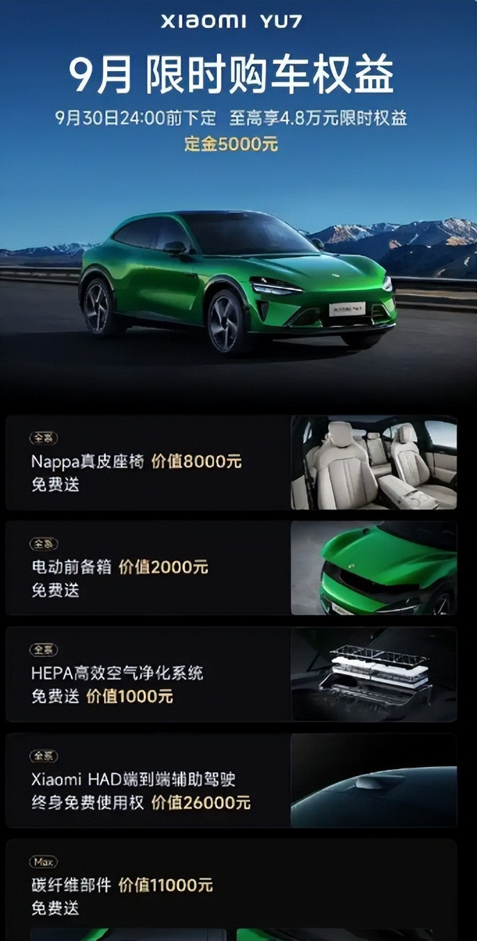 目前,市场上最炙手可热的小米汽车都给出限时优惠,由此可见,当下国内汽车市场的竞争惨烈。对于那些想购买小米汽车的用户来说,这次限时优惠也可以被视为一次力度不小的催单行动。按照雷军和小米汽车的做派,大概率不会有10月份再延续这个赠送的可能,至少短期内不会再有。所以趁着这个时间下定也是不错的。