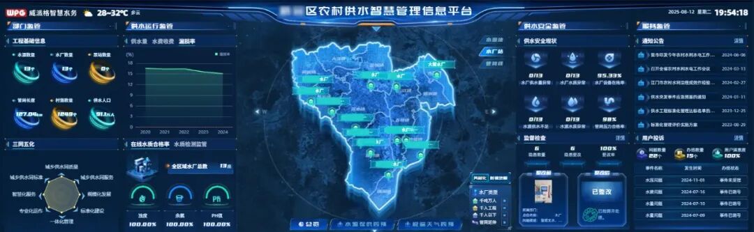 威派格紧扣政策导向与行业痛点,针对性破解农村供水 “点多、面广、量大” 导致的监管效能不足、运管成本高、风险管控弱、智慧化水平低等难题,研发的农村供水县域统管平台成为政策落地的关键技术支撑。