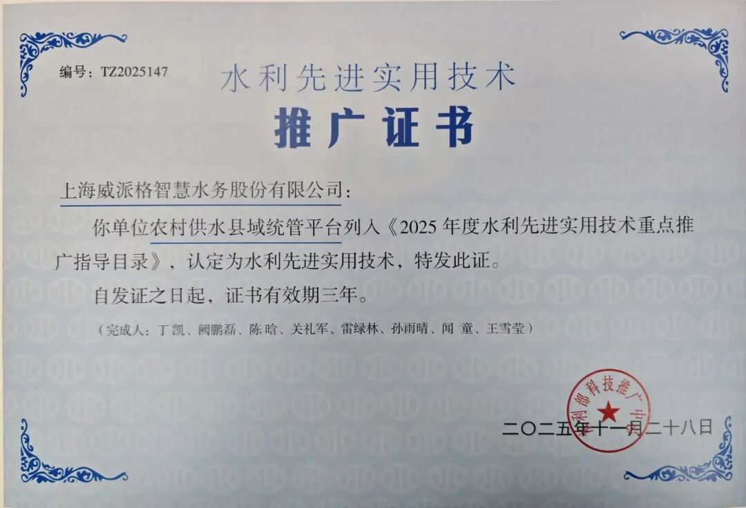 近日,上海威派格(603956)智慧水务股份有限公司自主研发的 “农村供水县域统管平台”,凭借其在农村供水领域的技术创新与实践成效,成功入选《2025 年度水利先进实用技术重点推广指导目录》,标志着该平台的技术水平与应用价值获得国家水利主管部门的权威认可。