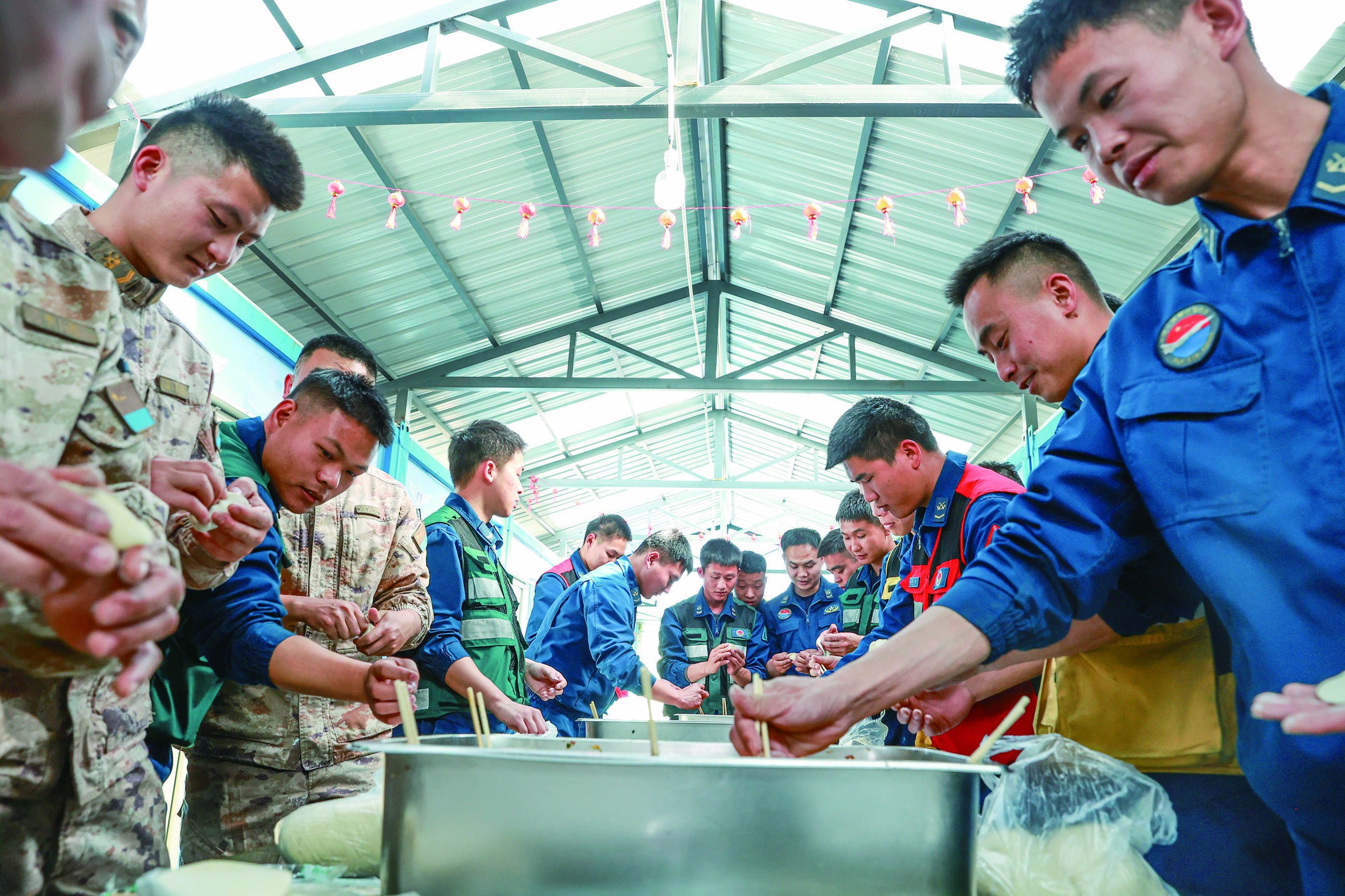 2月16日,空军航空兵某旅驻训分队组织官兵包饺子。蓝善湖摄当钟声敲响时
